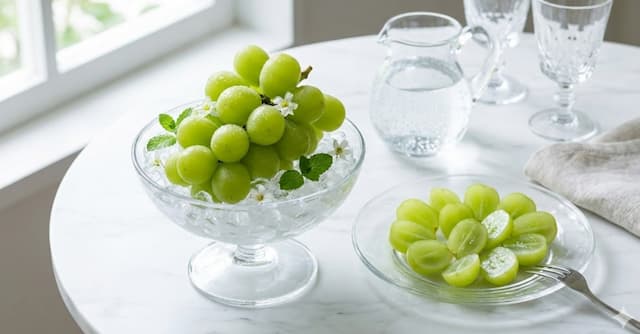 こうして皮をむいた果肉だけのマスカットは、口当たりが非常に滑らかで、また違った贅沢さがあります。ガラスの器に盛ると、まるで宝石のようです。