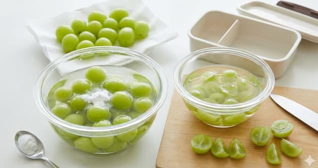 手順は簡単で、カットしたシャインマスカットを塩水に1分ほど浸けるだけ。その後は必ず水気をしっかりと拭き取ってください。これで、夕方まで綺麗な断面のエメラルドグリーンをキープできます。