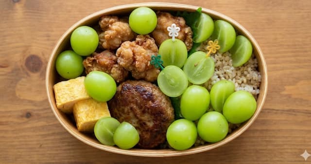 安全と衛生の基本を押さえたら、次はお楽しみの「盛り付け」と「アレンジ」です。シャインマスカットの鮮やかな緑色は、お弁当のビジュアルを一気に格上げしてくれる最強のアイテム。茶色っぽくなりがちな唐揚げ弁当やハンバーグ弁当も、この緑が入るだけでパッと明るく、食欲をそそる見た目に変身します。