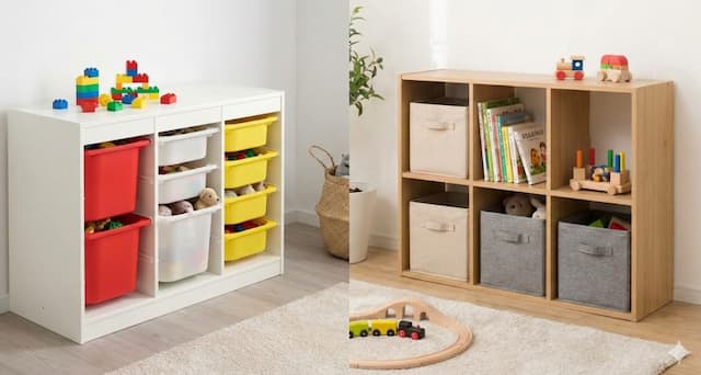 私自身の経験で言えば、子供が小さくおもちゃの管理が大変だった時期は、リビングにニトリのソフトインボックスを使った棚を置き、怪我の心配なく過ごせるようにしました。そして子供が成長して自分の部屋を持つようになったタイミングで、IKEAのトロファストを導入し、自分でお片付けをする自律心を育てるスタイルに移行しました。