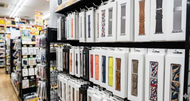 多くの店舗において、Apple Watchバンドは「スマートフォンアクセサリー」の売り場に置かれています。iPhoneケースや充電ケーブル、保護フィルムなどが並んでいる棚の近くを探してみてください。最近では、「iPhoneケースと色を揃える」というファッショントレンドがあるため、スマホケースのすぐ横にバンドが吊るされていることが非常に多いです。