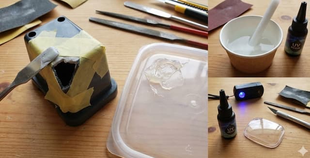 車のウィンカーレンズや、フィギュアのクリアパーツ、あるいは透明な収納ケースの角などが欠けてしまった場合、不透明なパテで埋めると見た目が台無しになってしまいます。そこで活躍するのが、セリアやダイソーのハンドメイドコーナーにある「UVレジン」と「おゆまる(型取り用樹脂)」です。