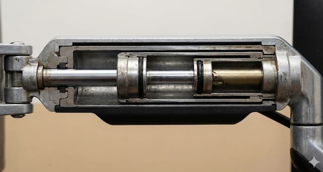 私たちが指一本で重いモニターをスイスイと動かせるあの感覚。あれを実現しているのが、アームの内部に隠された「ガススプリング(ガスシリンダー)」です。この部品の役割を簡単に言うと、空気入れのようなシリンダーの中に、非常に高い圧力で窒素ガスを封入し、その反発力を利用してモニターの重さを打ち消しているんですね。