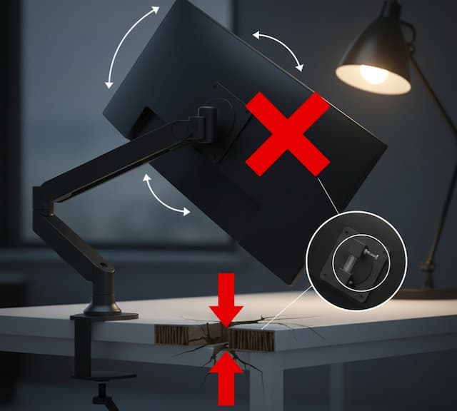 意外な盲点として、アーム自体ではなく「土台」に問題があるケースもあります。アームが全体的に手前に傾いてきたり、不安定で下がってくるように感じる場合、デスクの天板を確認してみてください。