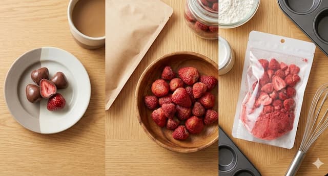 バレンタイン用として選ぶなら、私は断然「フリーズドライのホール(丸ごと)タイプ」または「ダイス(角切り)タイプ」をおすすめします。チョコレートの茶色やホワイトチョコの白に対して、フリーズドライいちごの鮮烈な赤色は最高のアクセントになります。
